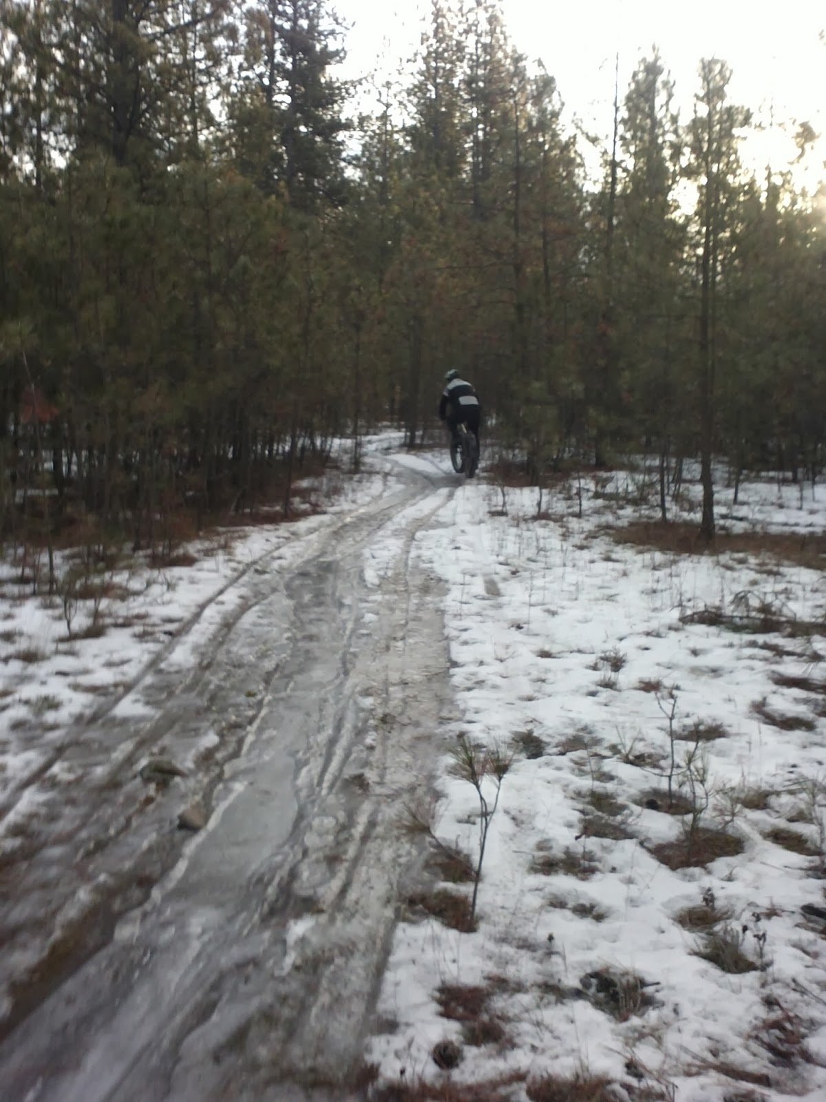 We arrive at about 7:20 AM this morning. We were bumming as we pulled into the 7-mile trailhead and saw all the iced-over trails. Glen hopped on his bike, rolled over a section of trail, and the bike just instantly slid out from under him.